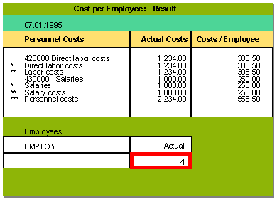 You create a report that displays the actual personnel costs that have been incurred in a specific department (for example, the marketing department) and the actual number of employees in the department. You then define a global cell to create an additional column that displays personnel costs per employee (see the graphic below).