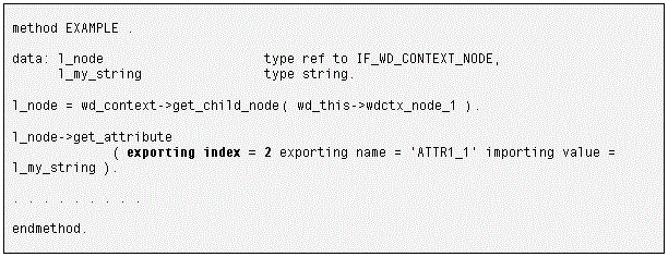 A reference to the required node element is generated using method GET_ELEMENT of interface IF_WD_CONTEXT_NODE. In the next step, the value of the Attr1_1 attribute of this element is passed to the l_my_string local variable.