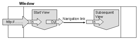 All views within one window can be connected through navigation links. This means that when a user calls a Web Dynpro application the view defined as the start view is the first view displayed on the screen. When an action is triggered (for example, by clicking on a pushbutton), a navigation is triggered resulting in the currently displayed disappearing and a second view being displayed instead.